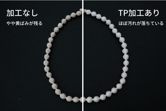 撥水・撥油・防汚の3つの機能を糸に施す「トリプルプロテクト加工」を独自に開発。シルク糸をトリプルプロテクト加工することで、シルクの風合いはそのままに、汚れにくく汚れても落ちやすいネックレスが出来ました。