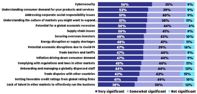 アジア企業が新規市場に進出する最大の目的は収益の拡大であることは依然として変わりませんが、昨今の地政学リスクや世界経済の停滞により、グローバル展開の道はますます複雑になってきています。回答者の大半は、「本社がある国内やアジア地域内での評判に比べ、海外での自社の評判は好ましくない」と感じており、海外進出における一番の課題は「サイバーセキュリティ」であると回答。また、日本では「海外市場における売上高と利益率が非常に重要」と答えた回答者は約半数にとどまりました。同様に、韓国では、国内での需要減少を補うために「海外での事業拡大が重要」と感じている回答者は多くないことが分かりました。