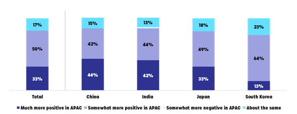 自社のレピュテーションについて、大半の回答者は「アジア太平洋地域外ではあまり良くない」と回答したのに対し、83%が「アジア太平洋地域内の方が良い」と感じていることがわかりました。