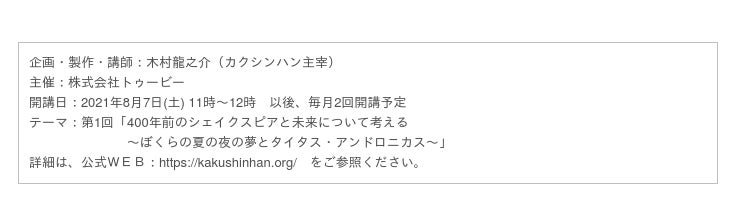 ▼講座概要:カクシンハン主宰 木村龍之介による『オンライン・シェイクスピア講座』