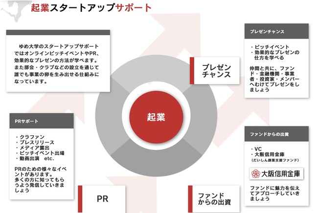 具体的な事業化を目指すため、資金調達面ではファンドやベンチャーキャピタル、金融機関などと連携。メンバー同士でブラッシュアップした企画で、ゆめ大学主催のピッチイベントに挑戦することができます。また、クラウドファンディングプラットフォーム(Makuake、READYFOR)との提携によりスタートアップをサポート。その後のスムーズな事業展開のため、さまざまな業種の事業者との橋渡しを行います。