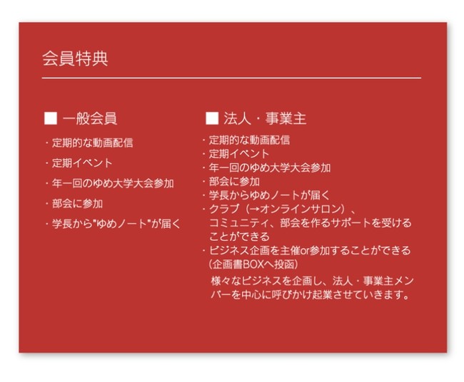 会員種別は一般と法人・事業主(個人事業も含む)の2種類。インタビュー動画の視聴、イベントや部会への参加は共通で、法人会員はサロン内コミュニティの立ち上げ・運営、ビジネス企画への参画が可能になります。さらに法人会員の大きな特典としてインタビュー動画(対外向け)への出演など、さまざまな形で広くPRできる環境を提供します。
