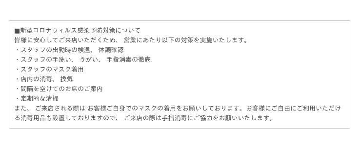 皆様に安心してご来店いただくため、営業にあたり新型コロナウィルス感染対策を実施しております。詳細は本記事最下部に記載してありますのでご確認ください。