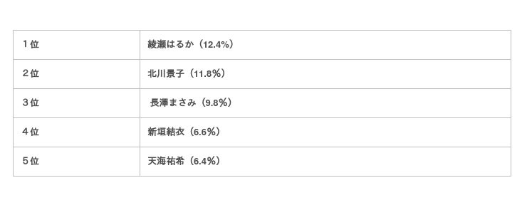 1位:綾瀬はるか 2位:北川景子 3位:長澤まさみ