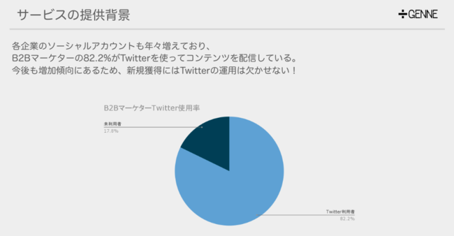 MA(マーケティングオートメーション)の運用代行や設計、マーケティングのサポートを行う、GENNE株式会社(代表取締役:久泉 陽 以下 GENNE)では、新規リード獲得施策として、多くのクライアントからのご要望により、アポイントが取れすぎるTwitter運用サービスを開始いたしました。