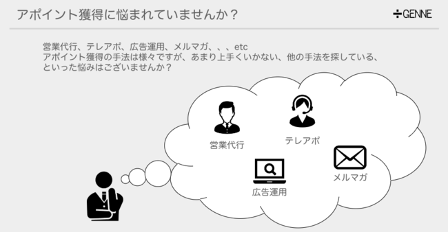 弊社ではアポイントの獲得だけでなく、見込客の管理・中長期的な追客から発注いただく状態をクライアントへ伴走し、創っていくことを行っております。全体の状態整理から施策の管理だけではなく、細かなコンテンツ制作もGENNEのメンバーで行っております。MA・SFAの運用に関してもお困りであれば、ツールの選定や初期のご相談に関しては、無料で受けておりますので、下記よりご相談いただければと思います。