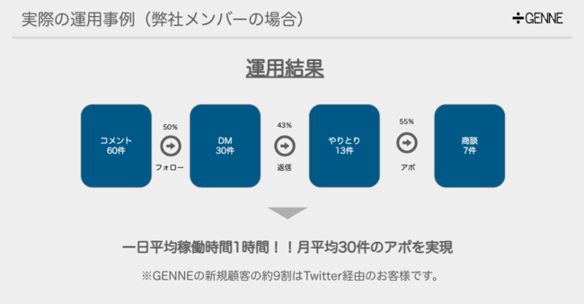 弊社は創業して現在、1年と6ヶ月を迎えようとしております。イレギュラーケースを除き基本的に外注への発注をせず、自社メンバーだけでご支援を完結させることに重きを置いている弊社のお取引企業数は有難いことに50社を超えました。少しずつでありますが、GENNE株式会社が大きくなっている要因の中でTwitter営業は受注経路の9割を占めるため、重要な施策として運用を続けてきました。