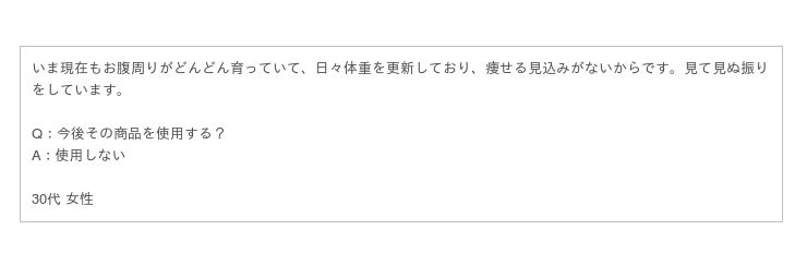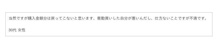 今回のアンケートの中で、衝動買いした品のジャンルに関らず「コロナ太り」を理由に衝動買いを後悔する声が、圧倒的に多かった印象を受けます。