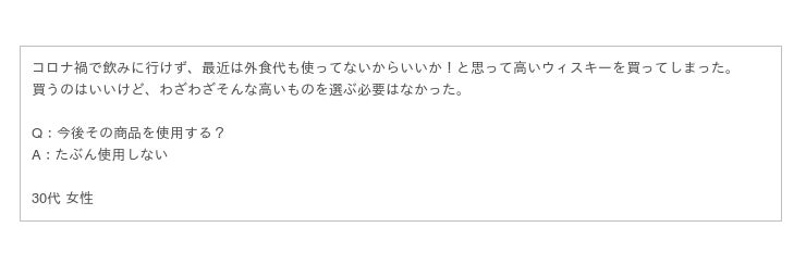 奮発して購入してみたは良いものの、口には合わなかったようで…かなり薄めてハイボールにして飲んでいたそうですが「今後たぶん使用しない」との回答結果でした。