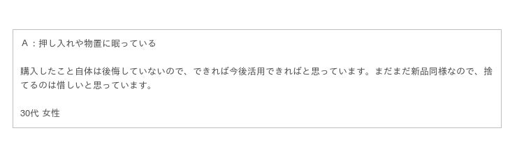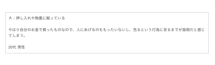 他の回答を合わせて見ても、購入品を手放した人の割合はわずか20%足らずという結果に対し「勿体ない」、処分したり売ることを「手間だ」と感じる人が多いことが回答の理由に繋がっているようです。