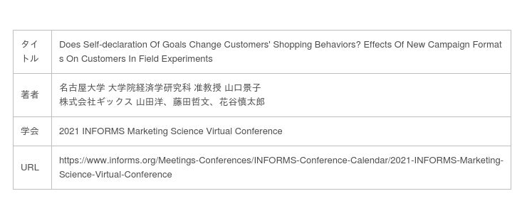 株式会社ギックス(本社:東京都港区、代表取締役:網野知博、以下:当社)と国立大学法人東海国立大学機構名古屋大学(総長:松尾 清一、以下名古屋大学) 山口景子研究室は、「新しいキャンペーン形態を通じた顧客のロイヤルティ向上」に関する共同研究について、6月3日に行われた「2021 INFORMS Marketing Science Virtual Conference」にて発表いたしました。