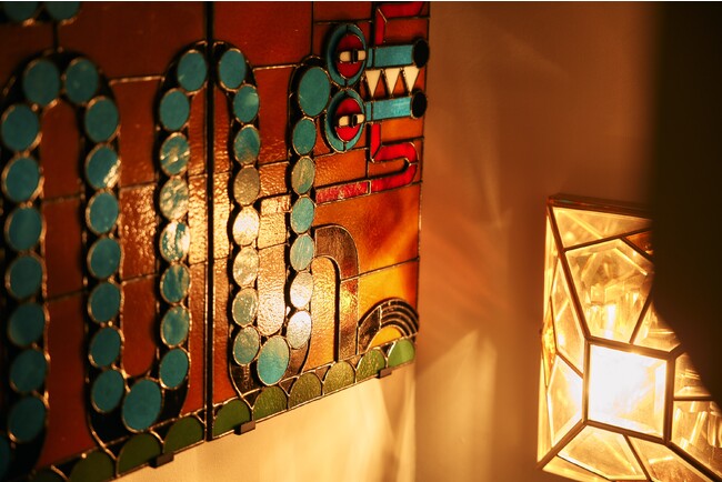 さらに同店の象徴的な看板は東京都内を中心に活動するステンドグラスアーティスト SHOJI(S-GLASS)氏による作品。 生き物の持つ力強さ、可能性、豊かさをガラスという制限のある素材と色を組み合わせて表現す る作風を生かしてBLUE THE THREEのオリジナル看板として鎮座。