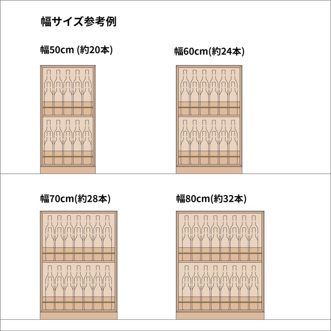 ボトルの収納量やお部屋にあわせて、幅サイズを50~70cmの間で5cm単位で設定可能なセミオーダー商品です。