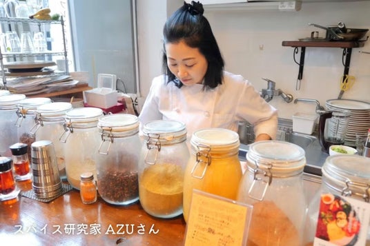 スパイス:スパイス研究家AZU CURRY監修の小麦粉を使っていないスパイスカレーです。フランス料理人としてフランス・神戸・大阪にて腕を振るったのち、サービス業などを経験し、2012年に独立。今は大阪・北新地に店舗を構え、非日常を楽しむカレーを提供しています。