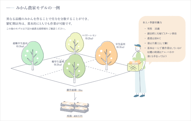 一人で管理出来る無理のないサイズの農地を持つことや、異なる品種のみかんを作り労力分散をすることで、一人でもできるみかん農家モデルを提案します。収穫が集中する繁忙期はパートを雇う必要も稀にありますが、一人でもやってみたい、家族の中で自分だけが農業をしたいとったニーズに応え、今の時代に合わせた形を提案します。一人モデル以外にも多様なみかん農家の形があります。受け入れ側である町・農協・県がお一人お一人に合わせ、新規就農のサポートをしっかりと行います。