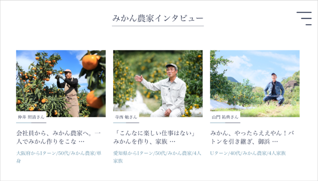 インタビュー記事に加えて、YouTubeを活用した動画での情報発信も行います。サイト公開時に4名の柑橘農家を、2022年度はみかんを始めとした農業に携わる方々のインタビューを公開予定です。