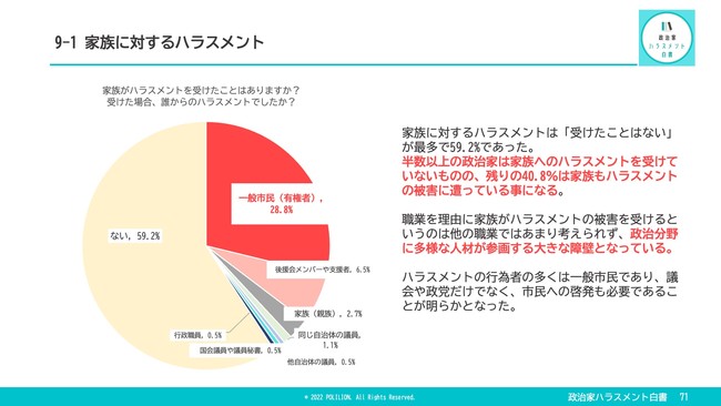 家族に対するハラスメントは「受けたことはない」が最多で59.2%。半数以上の政治家は家族へのハラスメントを受けていないものの、残りの40.8%は家族もハラスメントの被害に遭っている事になる。職業を理由に家族がハラスメントの被害を受けるというのは他の職業ではあまり考えられず、政治分野に多様な人材が参画する大きなハードルとなっている。
