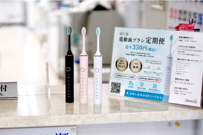 今回、朝原デンタルクリニックで販売開始する電動歯ブラシのサブスク「Dentaly(デンタリー)」(https://dentaly.jp/)は、「月330円(税込)で手に入れるワンランク上の生活習慣」をキャッチコピーとし、高価で気軽に購入できない電動歯ブラシを330円(税込)という低価格料金で始めることができます。電動歯ブラシの本体は無料で替えブラシは定期的にポスト投函されるため、ついつい買い忘れてしまう心配も不要です。