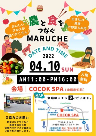 4月10日(日曜)11時から16時まで、沖縄市知花5-37-26 COCOK SPAにて入場無料グルメイベントが行われます。