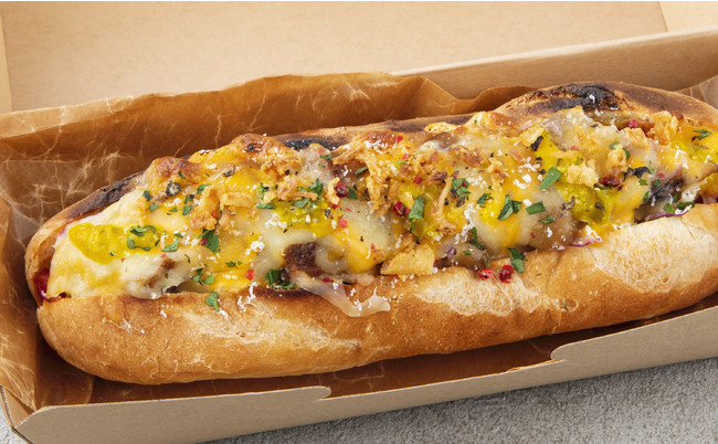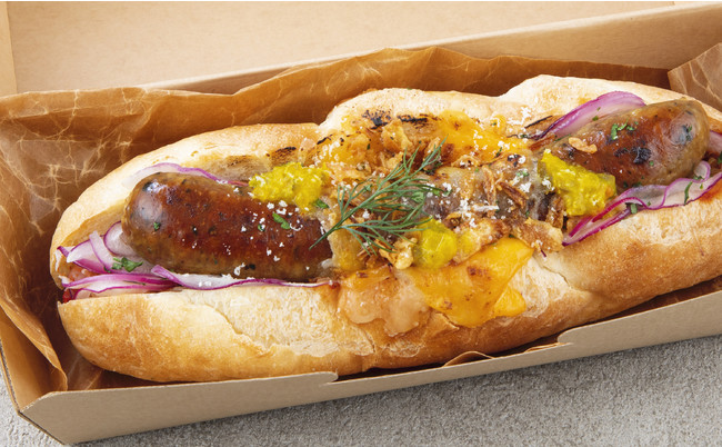 キビまる豚のすね肉をドイツの郷土料理「アイスバイン」にアレンジ。コラーゲンたっぷりの豚肉は、トロトロした食感なのにパンと合う新食感のホットドッグ!沖縄野菜の自家製レギュームブイヨンに白ワイン、ハーブなどでじっくり煮込んだ贅沢なデリです。