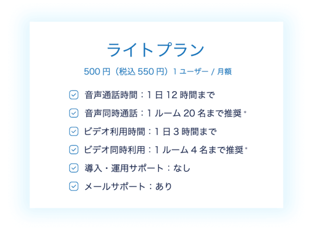 LIVEWORKでは、ビデオ利用時間・同時通話人数をコンパクトにした廉価版、ライトプランを1ユーザー月額 500円(税込550円)にて提供を開始しました。
