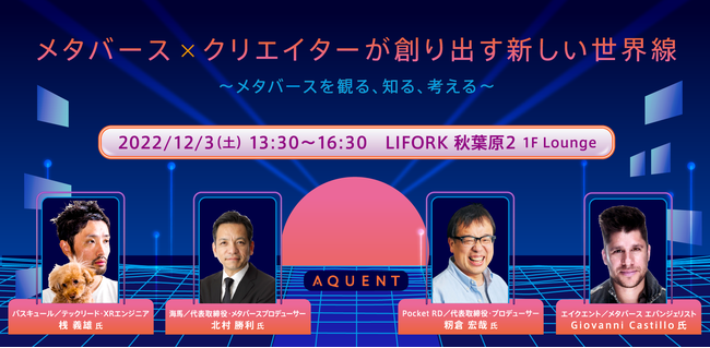 クリエイティブ・マーケティング・デジタル分野に特化した人材エージェンシー『エイクエント(本社:米国ボストン、国内拠点:東京・大阪・名古屋・福岡)』は、2022年12月3日(土) に、オフライン(会場) とオンライン配信のハイブリット型にて、メタバース分野に興味のあるクリエイターまたマーケターを対象にした無料セミナー『メタバース x クリエイターが創り出す新しい世界線』を開催いたします。ゲストには、メタバース分野のトップランナーたちをお迎えし、メタバースの現在地と未来の可能性についてたっぷり語っていただきます。参加費は、オフライン(会場) /オンラインともに無料(事前申込制)です。