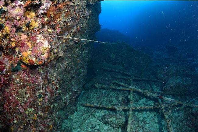 ホーシューは、水深数mから30mの海底まで落ち込むドロップオフ(崖)が特徴的なダイビングポイントですが、岩やサンゴにはゴミや釣り糸などが多く絡みついています。