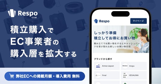 株式会社リスポ(所在地:東京都渋谷区、代表取締役:黍田龍平)は、ライフイベントに合わせて毎月一定金額を積立て購入することで、商品をお得に購入できる「積立購入ECサイト『Respo(リスポ)』」を2024年1月10日(水)より提供開始しましたことをお知らせいたします。なお、β版では約3ヶ月で延べ150名の利用ユーザーに活用され、900万円を超える積立てが行われました。