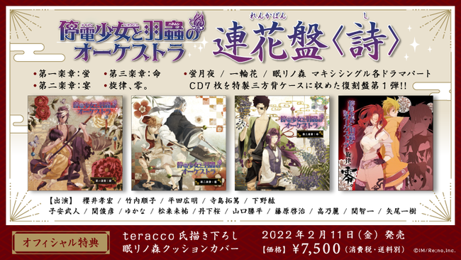 「連花盤(れんかばん)」は ドラマCD本編全7巻を、前半:詩(し)・後半:愁(しゅう)に分け、当時発売していたマキシシングルに収録されていたミニドラマや、外伝的な小噺を全てまとめたお得な廉価版となっております。ここから物語に触れて頂く方はもちろん、既に作品を知ってくださっている方にも嬉しい、特製ケースと各種特典付きです。