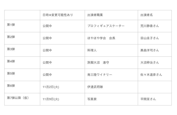 また、 「みやぎ12人の侍°ズ」動画も続々と公開中。第3弾の出演者は、「楽・食・健・美 -KUROMORI-」オーナーシェフの黒森洋司さん。第4弾は老舗湯治宿「旅館大沼」の湯守 大沼伸治さん。第5弾は南三陸ワイナリーの佐々木道彦さん。第6弾は伊達武将隊(11月2日(火)配信予定)です。