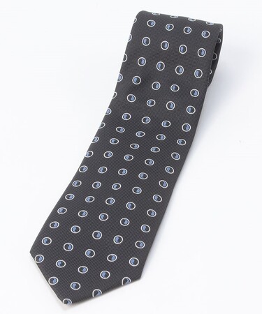 クールなネイビーに明るいブルーのモチーフが清潔感のあるネクタイ。胸元に謙虚さを添え、品格を備えたスーツスタイルに仕上げます
