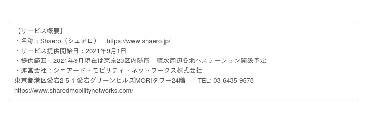 シェアード・モビリティ・ネットワークス株式会社(本社:東京都港区、代表者:畑 翼)は、2021年9月1日(水)に、折りたたみ電動バイクのシェアリングサービス「Shaero(シェアロ)」の提供を開始いたします。
