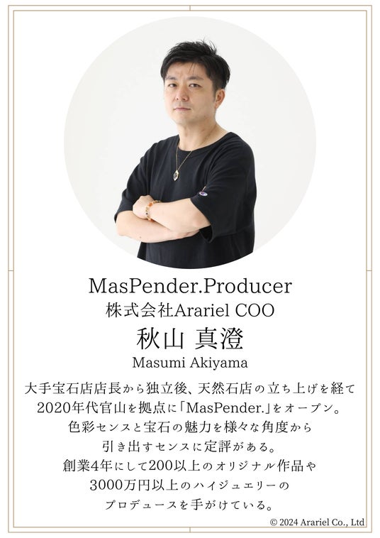 2020年に代官山で誕生したジュエリーブランドMasPender.は天然石店のSherryranticcaやヒーリングサロン事業を手掛ける株式会社Arariel COOの秋山真澄がプロデューサーを務めるジュエリーブランドです。