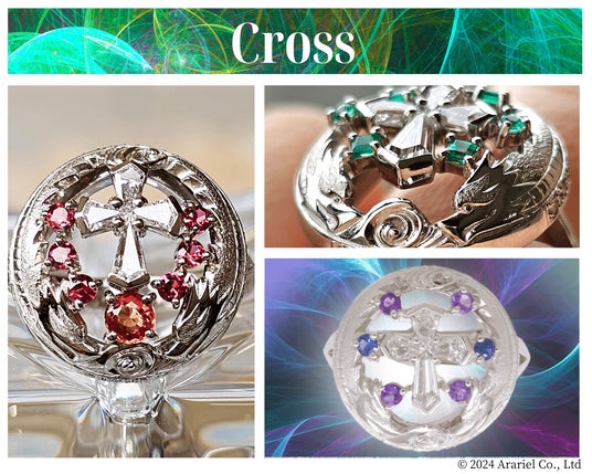 ダイヤモンドのクロスを中心に左右の龍が向き合ったデザインです。“魚や亀から進化して龍になり天に昇る”“人は十字架の贖罪によって天へと召される”二つの共通点は地上のものを昇華させ天界へと導く(繋ぐ)ものを象徴しています。