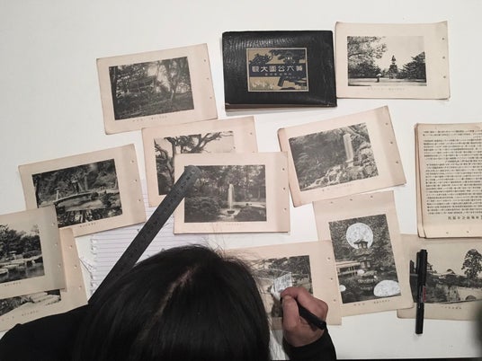 岩井優による滞在制作の1コマ。まちで生まれたアイデアやドローイングも各施設に展示されている。