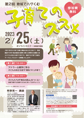 埼玉県狭山市では、オンラインセミナー「第2回地域でハグくむ子育てのススメ」を2023年2月25日(土)に開催いたします。
