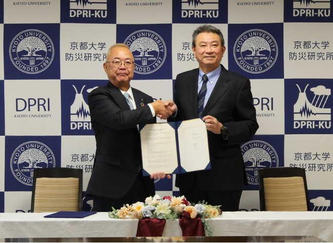 飛島建設株式会社(本社:東京都港区、社長:乘京 正弘 以下「飛島建設」)と京都大学防災研究所(所長:中北 英一、以下「京大防災研」)は、このほど河川流域や中山間地での災害予測や対策工法などの研究開発を共同で推進する包括的連携協定を締結しました。本協定の締結式は10月23日に京大防災研で行われました。京大防災研と包括的連携協定を結ぶのは総合建設会社としては初めてとなります。