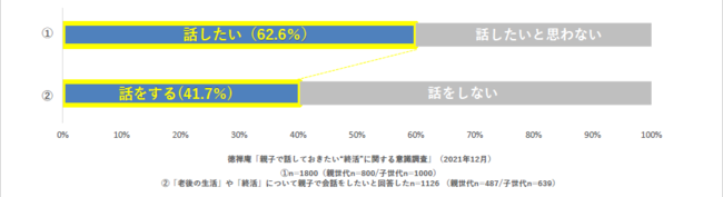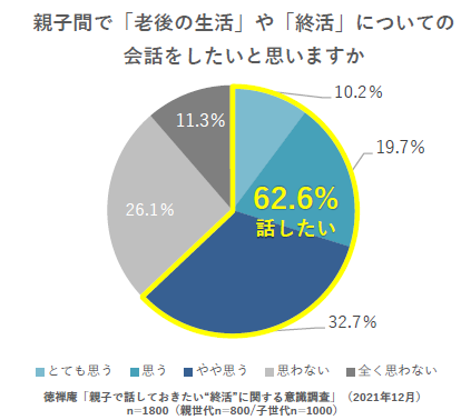 「老後の生活」や「終活」について、親子で話をしたいか尋ねたところ、話したいと回答した人は全体の6割(62.6%)を超えた。