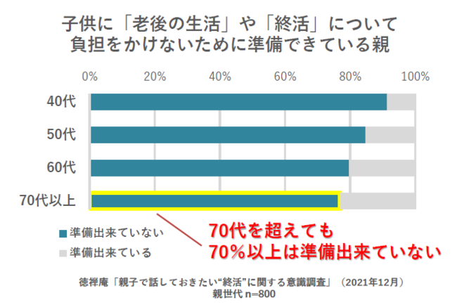 「お墓のことで子供や孫に負担をかけたくない」と回答した親世代が全体の91.9%でほとんどだったが、実際に準備出来ているという親世代は全体の21%。