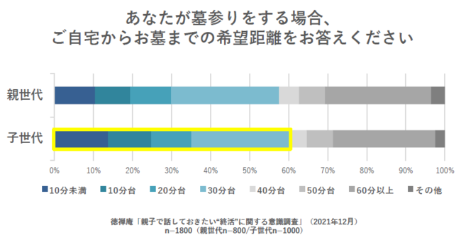 お墓までの理想の距離を尋ねたところ、親世代の57.5%、子世代の60.2%が「30分台以内」と回答。総務省統計局が発表した「社会生活基本調査からわかる47都道府県ランキング」によれば平日の1日あたりの通勤・通学時間は全国平均で往復1.19時間となっており、片道だと30~40分程度かけていることになるため、お墓までの理想の距離は通勤・通学の時間と同程度であるといえる。
