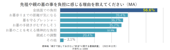 子世代にお墓のどういった点を負担に感じるかという質問に対して、「金銭面での負担」と回答した方が56.6%と最も多い結果に。次いで「お墓参りまでの距離が気になる」(39.4%)と、お墓の維持にかかる金銭面での負担やお墓までの距離という回答が理由として多く上がった。子世代の負担を軽減するためには「金銭面」や「距離」を考慮し、準備を進めることが重要であるとわかった。