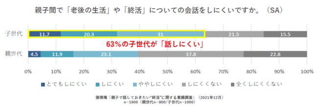 「老後の生活」や「終活」について、親世代は39.5%、子世代では63%と、子世代の方がより話しにくさを感じていることが判明。