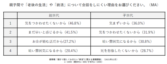 「老後の生活」や「終活」について話しにくい理由として、親世代では「気をつかわせたくないから」(46.8%)、「まだ早いと感じるから」(41.4%)、「お金が絡む話だから」(27.2%)と、子供に気をつかったり、タイミングを伺ったりしているような回答が多く上がった。一方子世代では「気まずいから」(36.0%)、「気をつかわせたくないから」(31.9%)、「暗い雰囲気になるから」(30.8%)、「死を想像したくないから」(28.7%)と、親子で会話をする際には暗い話題を避けようとしている傾向が伺えた。