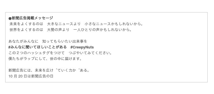 2021年10月20日の「新聞広告の日」に際し、同15日から21日までの「新聞週間」中、ヒップホップユニットのCreepy Nutsさんを起用した全ページ広告を、全国86紙に掲載しました。読者の「みんなに聞いてほしいこと」をツイッターで募集し、3200件以上のリツイート、約1400件の自身の想いや身の回りの出来事を投稿いただきました。