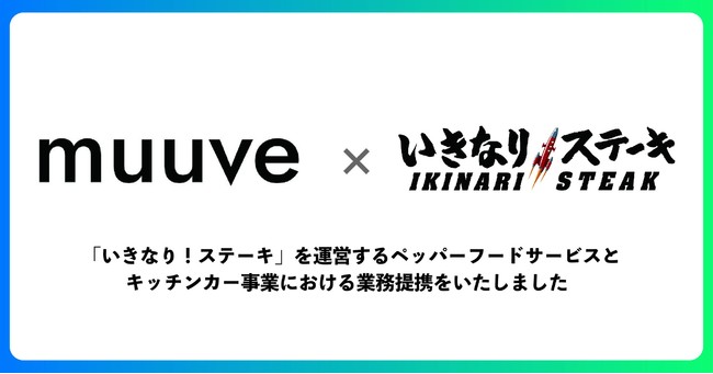 今回の業務提携にて、muuveはペッパーフードサービスが運営する「いきなり!ステーキ」のキッチンカー事業の運営を開始します。これまで「いきなり!ステーキ」キッチンカーで販売してきた商品価値やお客様満足度の向上を目指し、より良い商品の提供を行ってまいります。