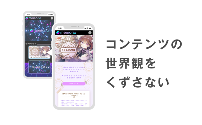 株式会社メモリア(本社:東京都豊島区、代表者:倉谷一圭)は、2022年2月15日(火)に、コンテンツの世界観を崩さずにNFTを販売できるブランディング型NFTマーケットプレイス『memoria(メモリア)』(https://www.memoria-nft.com/)で、エイベックス・ビジネス・ディベロップメント所属のASMRボイスアーティスト蒔田つぐみの”うごくASMR”コンテンツのNFTコレクション(全4種類、限定200個)が販売開始から3日間で完売したことを発表しました。