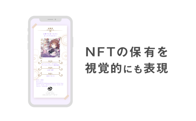ブロックチェーン上だけでなく、視覚的にもNFTの保有をわかりやすく表現することができるので、NFTを購入したユーザーがSNS等でより共有しやすい設計となっています。