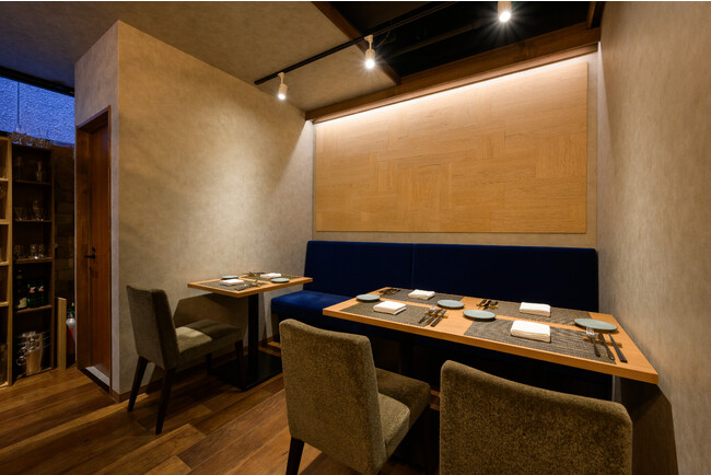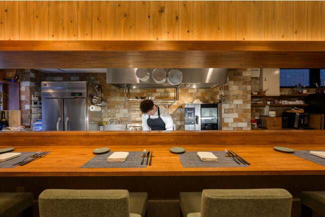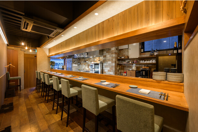 木をメインとしたオープンキッチンの落ち着いた店内。オープンキッチンから様々なお料理が仕上がるライブ感、音や香りも特別な時間をより一層ひきたてます。お一人様やカップルにもご利用いただけるカウンター席や奥には最大6名様までご利用いただけるテーブル席も完備しております。落ち着いた雰囲気でゆったりとお過ごしいただけるのも魅力の一つ。普段使いはもちろん、記念日など特別な日のディナーにもおすすめです。