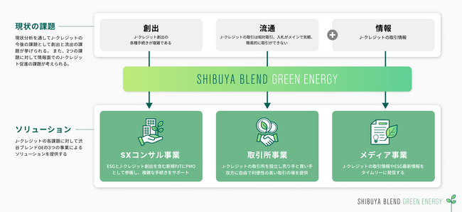 渋谷ブレンド株式会社(東京都渋谷区、代表取締役:細目圭佑)は企業が抱えるESG活動の課題に対して、渋谷ブレンドグリーンエナジー株式会社(東京都新宿区、代表取締役吉岡賢史、以下、「渋谷ブレンドGE」)を設立し、SXコンサル事業、カーボンクレジット流通事業、メディア事業の3つの事業を展開いたします。
