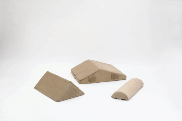大きめの三角柱と小さい三角柱、そして長いかまぼこのような半円柱。この3つのクッションを面ファスナーで組み合わせてひとつのクッションに!